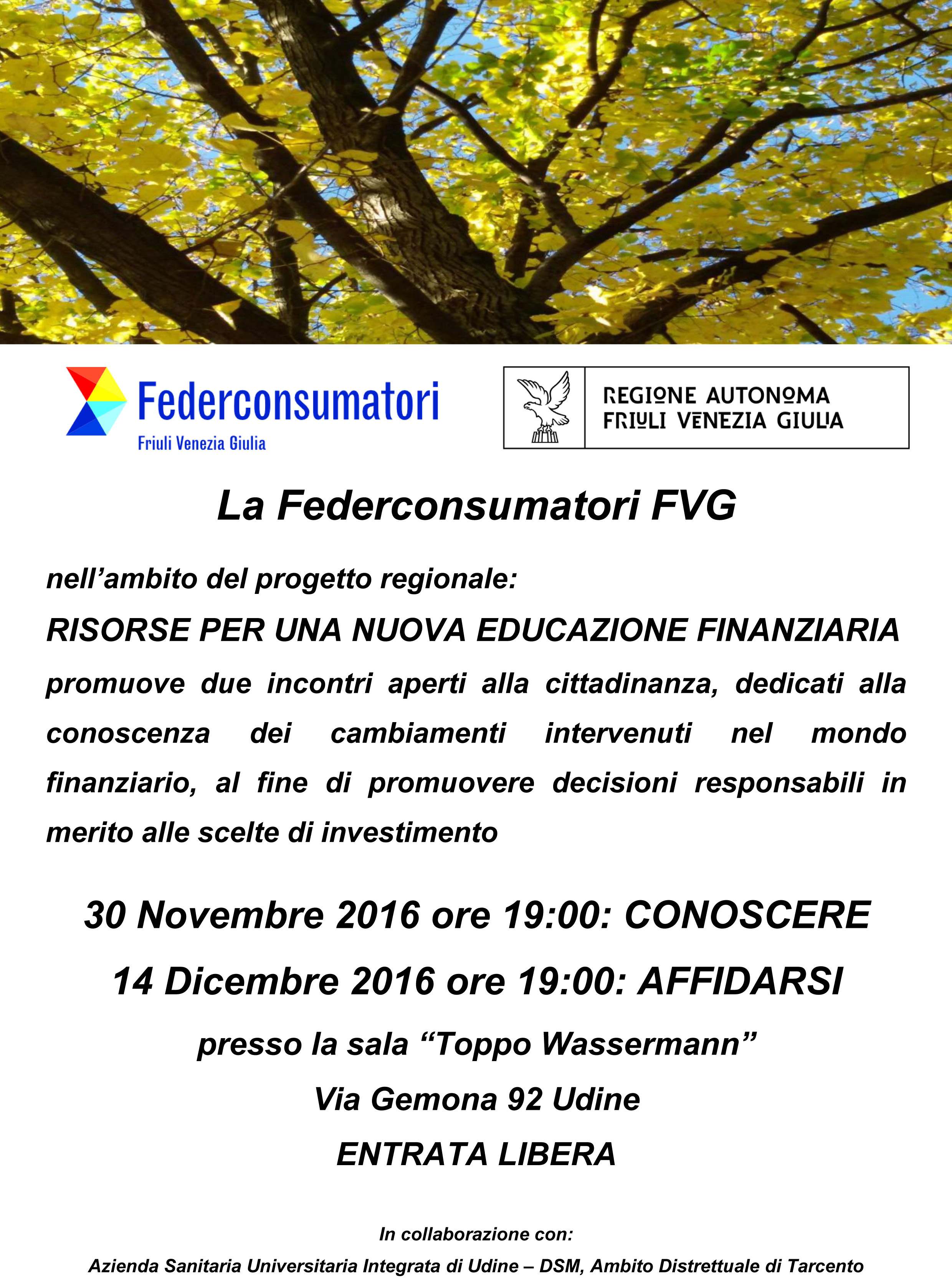 30 novembre 2016Questa sera dalle 19.00 a Udine in via Gemona n. 92, Aula Toppo Wassermann, si terrà il primo dei 5 convegni sulle “Risorse per una nuova educazione finanziaria”. Si parlerà degli attuali casi di risparmio tradito e delle regole...